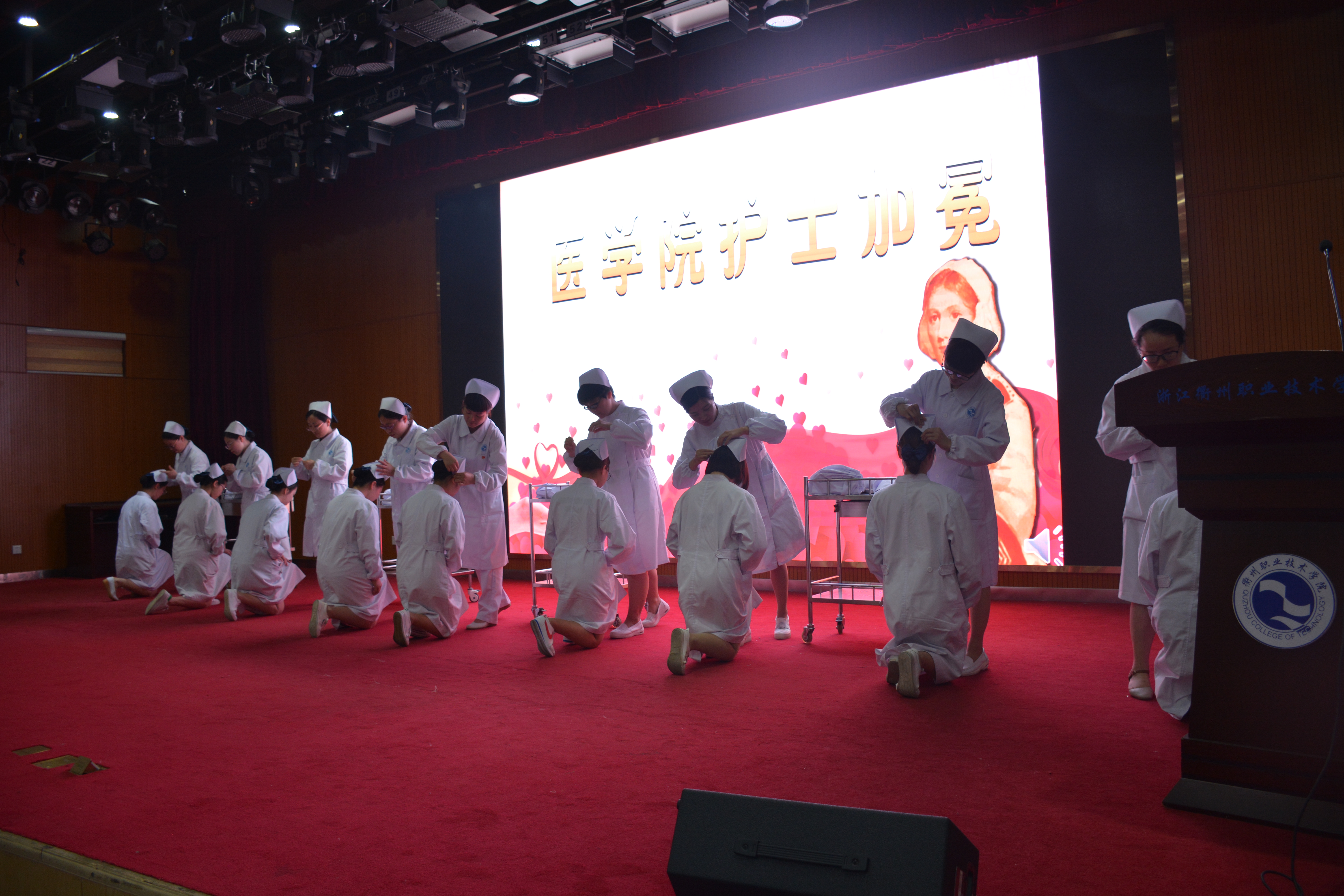 随着音乐声响起,护士加冕仪式正式开始。烛光闪耀、薪火相传,护生们身着白色护士装,面带微笑,迈着整齐的步伐走向主席台,缓缓下跪接受燕帽。罗烨老师带领全体护生进行了庄严的宣誓。