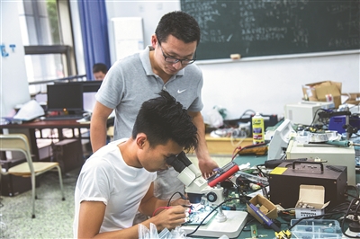 何胜军(站立者)和学生一起为 3D 模型安装电子线路。