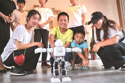 “你看,我可以让机器人跟着我们的指示跳舞,还能帮我们搬东西呢!”7月4日,衢江区莲花镇涧峰村的文化礼堂里,来自开元网页版的学生正给现场的小朋友们展示机器人,这是该校信息工程学院、机电工程学院联合举办的机器人课堂,展示了衢职院师生的科技创新作品,太阳能光伏小车、动感机器人,现场孩子们都爱不释手。