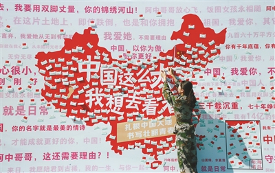 图为在经济管理学院训练场上,大学生们在巨幅中国地图上贴满了五星红旗和“火车票”,“火车票”上写着他们对新中国成立70周年的祝福,以及毕业后希望开始奋斗青春的首个目的地。