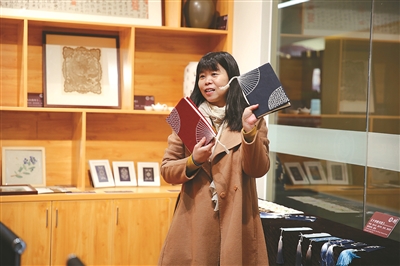 衢州市特殊教育学校的老师给大学生们介绍刺子绣。