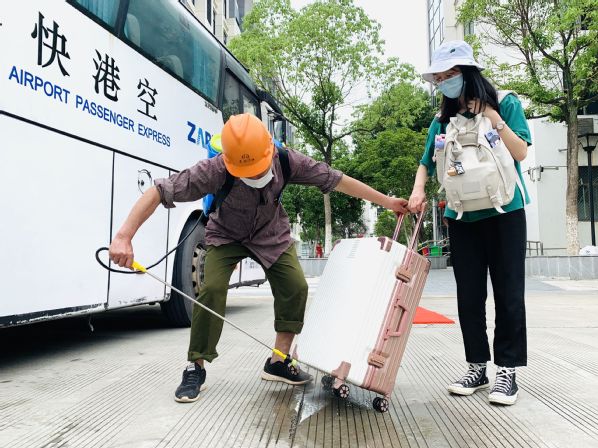 教职员工为到校生进行行李消毒