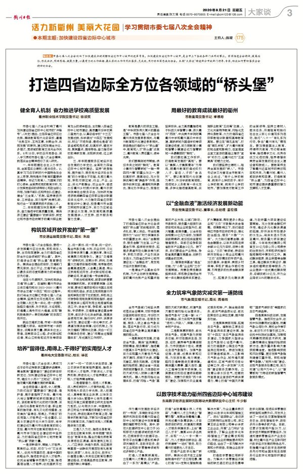 三、牢牢把握服务区域经济社会发展的办学定位,全面助力四省边际中心城市建设。坚持“俯身贴地、提升能力、服务地方经济社会发展”的办学理念不动摇,扎根三衢大地,积极对接区域、行业、产业、企业,深化产教融合、校企合作,继续办好衢州乡村振兴学院、衢州农民学院等社会服务平台,加快研究推进浙皖闽赣四省边际职业培训联盟实体化运作,大力推动四省边际职教培训中心建设,投身衢州市全国文明城市创建工作,努力为区域经济建设大发展、快发展和高质量发展提供人才支持、技术服务和智力支撑。