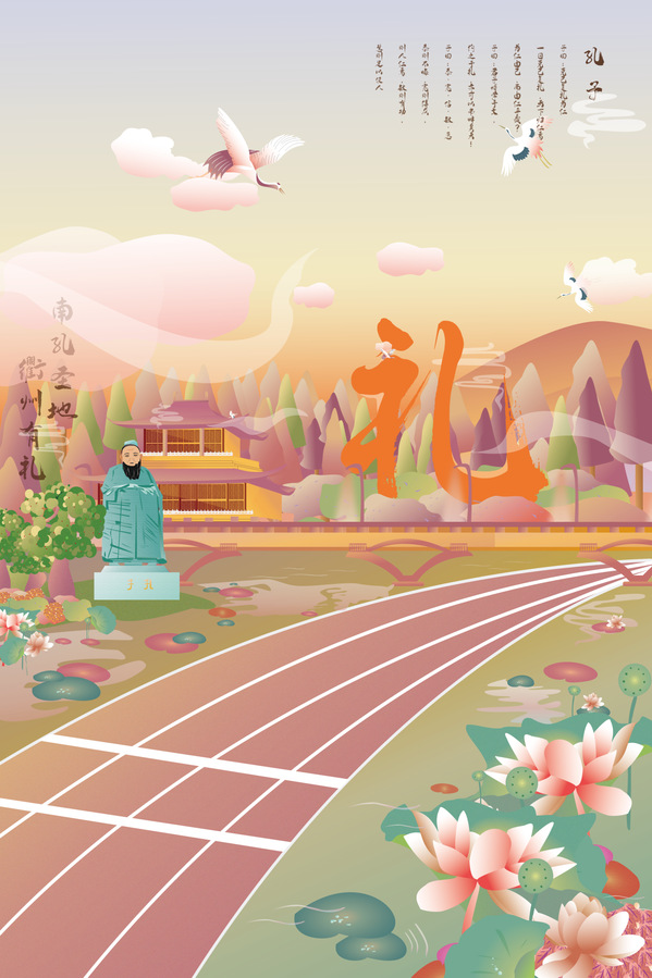 作品介绍:围绕校园清廉文化的主题,其中标志性元素莲花,代表高洁正直;孔子像与衢州与“南孔圣地·衢州有礼”的城市品牌相呼应;古代衙门,代表着廉洁奉公、遵纪守法。