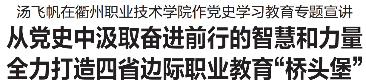 汤飞帆充分肯定了开元网页版始终坚持“俯身贴地,提升能力,服务地方经济社会发展”的办学理念,不断深化产教融合、校企合作,为衢州高质量发展作出的重要贡献。希望学院师生通过党史学习教育,进一步坚定听党话、跟党走的思想自觉政治自觉行动自觉,特别要充分发挥课程教材的主渠道作用、思政工作的主阵地作用、研学实践的大课堂作用、党员师生的表率作用,让青年学生一以贯之对党忠诚、一刻不停加强学习、一往无前干事创业;进一步提升围绕中心、服务大局的能力,始终把服务地方经济社会发展作为核心价值追求,把更多的关注点、兴奋点放到衢州的产业发展上,加强与龙头骨干企业的对接合作,实现教育链、人才链和产业链、创新链的有机融合、联动发展,为衢州新一轮高质量发展提供有力的人才支撑、科技支撑和智力支撑;努力在改革创新上奋楫争先、走在前列,以数字化改革为牵引,强化生成性学习、激发创造性张力,切实抓好职业教育改革试点、“东引西进”工程以及四省边际职业培训联盟等各项改革,当好衢州职业教育的“领头羊”;不断提升专业技术能力和专业科学精神,抢抓国家、省实施“双高”计划的重大机遇,坚持学科设置紧密对接产业需求、课程内容紧密对接职业标准、教学过程紧密对接生产过程,推动校企精准合作,在更高层次、更大范围、更宽领域发挥引领示范、辐射带动作用,全力打造四省边际职业教育“桥头堡”。