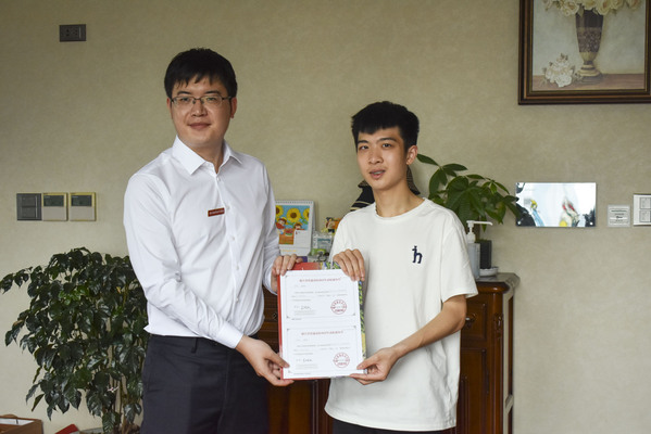 傅志昂博士化身“快递员”向徐展送出了由校长吕延文亲笔签发的全校第一封录取通知书,并勉励徐同学要下决心努力学习、实践,加强技能修养,提升综合素质,争做行业技术能手。