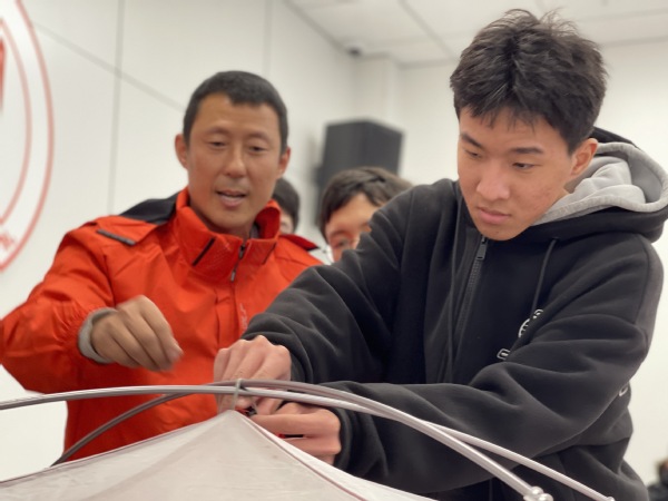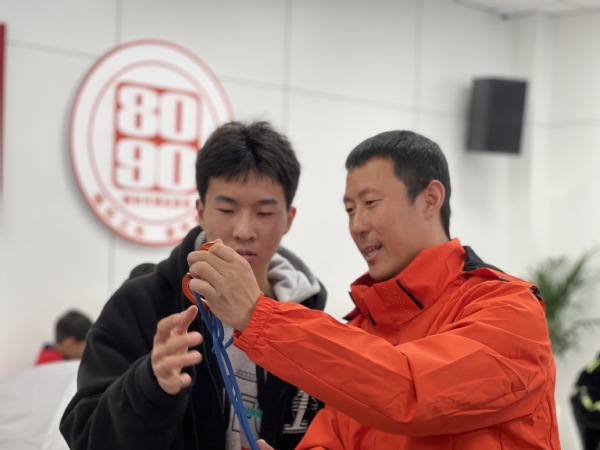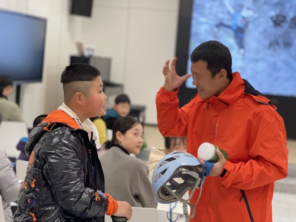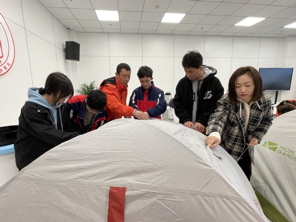 王俊舰首先讲述了自己的徒步经历,同时,他带来了登山包、头灯等10多件户外用品,现场教授使用方法。在搭建帐篷环节,王俊舰让每位学员亲自动手参与。