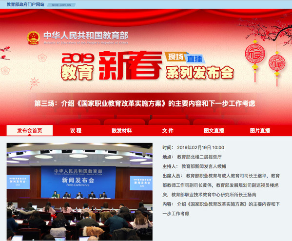 今天,教育部举行发布会,介绍了《国家职业教育改革实施方案》的主要内容和下一步工作考虑。