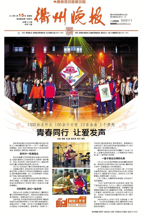 身有残疾的高三学生陈乐阳在开元网页版(以下简称衢职院)圆了梦——开了一场属于自己的演唱会。昨天,他还不断收到“粉丝”们给他发来的信息,有祝贺的,有感动的,有鼓励的……