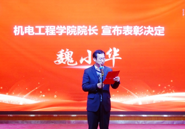 12月29日晚,机电工程学院第十二届机电文化节闭幕式暨2024级迎新晚会在校图书馆一号报告厅隆重举行。机电工程学院党总支书记朱峻、院长魏小华、全体班子成员、教职工、参赛学生以及24 级新生参加。