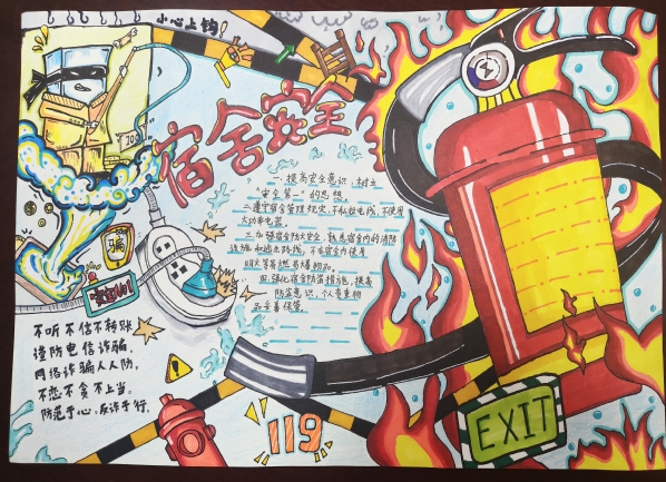 活动邀请同学们围绕学生公寓安全的多个方面展开创作。在创作过程中,同学们尽情挥洒创意,运用了彩色铅笔、水彩、剪贴画等多种艺术手法,将原本枯燥的安全知识转化为一幅幅色彩斑斓、生动有趣的手抄报。有的作品以消防安全为主题,通过生动的火灾逃生场景描绘,提醒同学们时刻保持警惕;有的作品则聚焦于用电安全,用形象直观的漫画形式展示了正确用电的重要性;还有的作品结合防盗防骗知识,巧妙融入智斗骗子的故事情节,既富有教育意义又引人入胜。