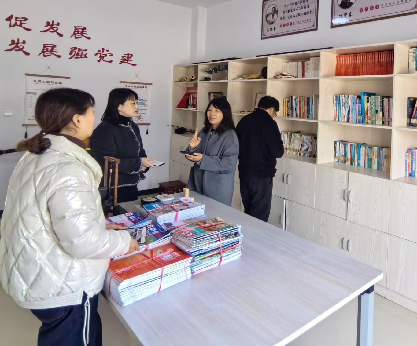 调研小组对金山村阅驿站的藏书进行了系统化盘点,该驿站内图书种类丰富,涵盖农业技术、文学经典、少儿读物及党建理论等多个领域,书架陈列整齐有序,阅读环境温馨舒适。馆员们逐一核对书目信息,并对书籍流通数据进行分析,为后续资源补充与调配提供科学依据。
