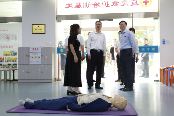 黄希和一行先后走访了消监控室、校园数字中枢、安全考核站、应急救护培训基地、校警驿站等,详细了解我校消防安全监控系统运行及应急处置流程,数字化安全风险预警、人流监控的创新实践,警校联动机制在合力打造5A平安校园工作中的具体实践成效,同时,了解了安全考核站安全技能培训考核体系和应急救护课程开展情况。
