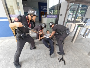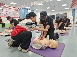 717日上午,一场“不打招呼”的反恐防暴演练在西门骤然打响:一名“可疑人员”持刀试图翻越强行闯入校园,值班安保人员第一时间触发一键报警,3分钟内,巡逻人员携带防暴钢叉、盾牌迅速集结形成包围圈,最终“可疑人员”被制服移交警方。除了“对抗式”演练,技能培训同样“干货满满”。市巡特警支队教导员通过“情景模拟+动作分解”,手把手教授安保人员如何利用防暴器械形成“三角阵型”控制局面;智慧新城消防救援大队教官现场教授消防设备使用,演示灭火器“提、拔、握、压”四步操作法,并组织参训人员用模拟火源反复练习;医学院相关老师则开展了心肺复苏等技能培训。